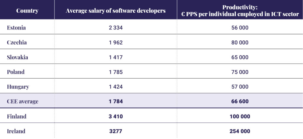 Gauging average ICT-sector incomes is difficult, as wages vary according to position, experience and location. With this in mind, the Central European Times focussed on software developer salaries in the Visegrad Four (V4) countries – Poland, Czechia, Hungary and Slovakia – on the Payscale database, and compared them to regional frontrunner Estonia and European digital leaders Finland and Ireland. Productivity and earnings do not necessarily correlate: in Estonia the average software developer earns EUR 2,334 per month, as compared to EUR 1,424 in Hungary, despite respective labour productivity rates being practically identical (EUR 57,000 and EUR 56,000), the Digital Economy and Society Index (DESI) found.