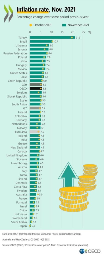 Price rises in Central and Eastern Europe (CEE) countries were mostly above the Eurozone average of 4.9% in November, as inflation surged at the highest rate for 25 years, according to the latest data of the Organisation for Economic Cooperation and Development (OECD).