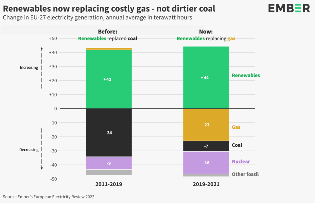 However as Europe experienced gas price rises of up to 585% in the second half of 2021, the cost of gas increased seven-fold, making it less competitive than other sources. As Ember notes, from 2019-21 renewables predominantly replaced natural gas, whereas from 2011-19 they replaced coal.