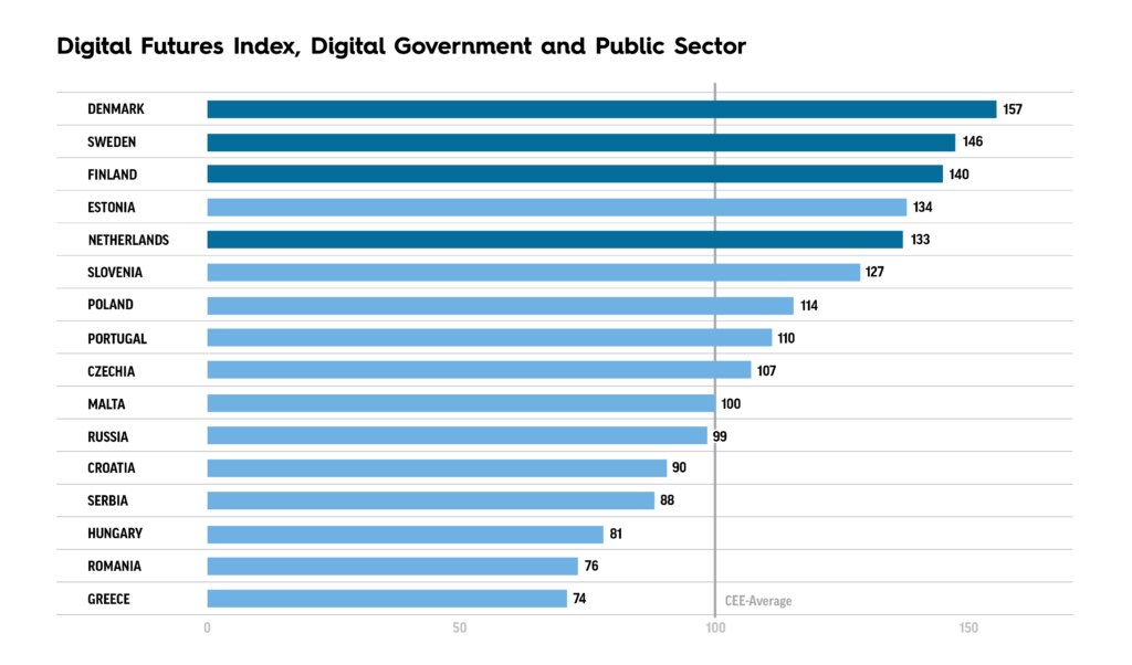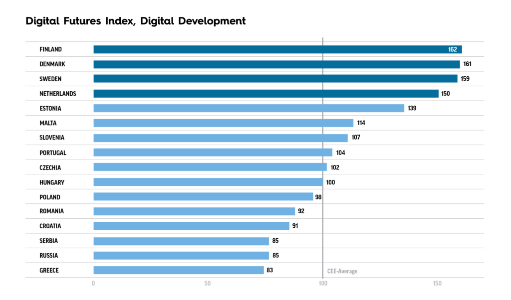 The Digital Futures Index (DFI) ranks countries of the region in terms of digital development and draws a direct connection between this and their wealth and competitiveness. It shows, CEE as a whole still lags Europe’s digital frontrunners like Denmark, Finland, Sweden and the Netherlands, but Estonia is rapidly catching up. Detached from its regional peers, Estonia has 132 index points on digital development, while Hungary scores the 100 average and Serbia, Russia and Greece bring up the rear with 83-85 index points.