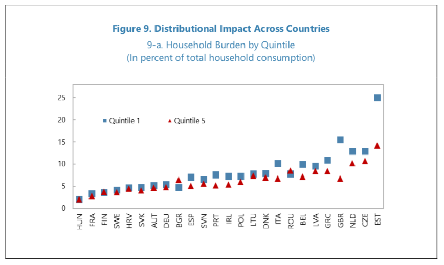 Estonia also had the largest disparity in relative costs between the richest 20% and poorest 20% of its households, as living costs for the first quintile in the Baltic country are expected to rise by around double those of the fifth quintile.