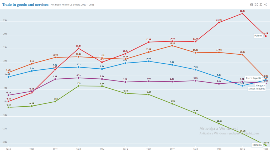 Trade in goods and services, Poland, Czechia, Hungary, Slovakia, Romania, millions US dollars, 2010-21