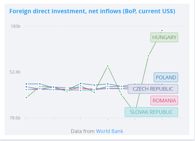 Hungary foreign direct investment, net inflows (balance of payments, US dollars) 2010-21/ Source: World Bank