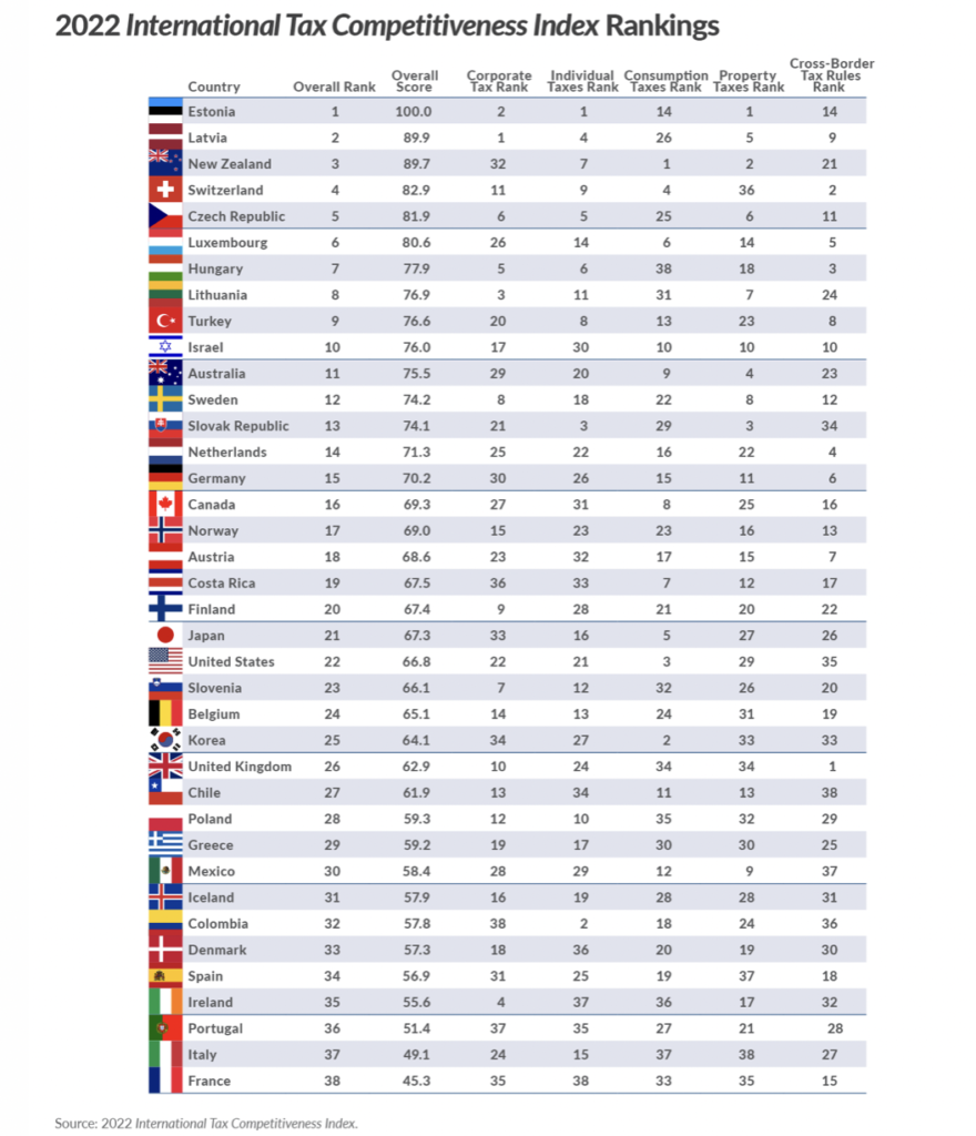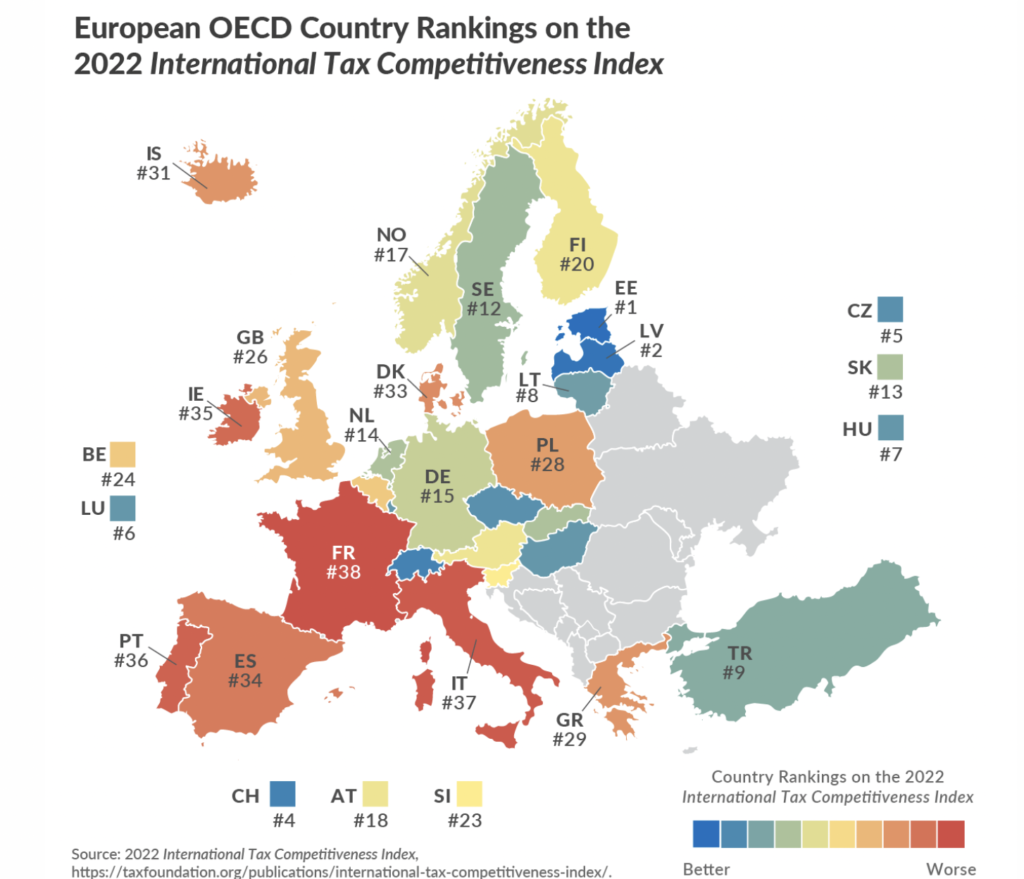 Nearby Latvia retains its second place on the ITCI. Business advantages in Latvia include the government only levying taxes on distributed earnings, allowing companies to reinvest profits tax-free. Moreover, corporations in Latvia can deduct property taxes when calculating taxable income, while labour levies are “relatively flat”, which allows the government to raise revenue from taxes on workers with very few distortions.