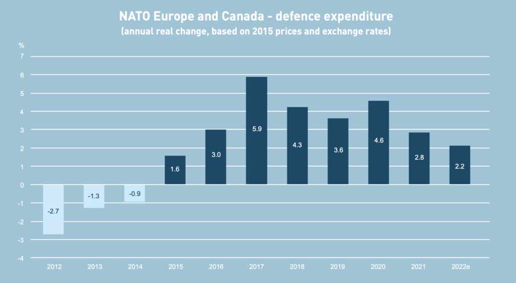While some members of the North Atlantic Treaty Organisation are pushing for higher military expenditure in the light of Russia’s invasion of Ukraine on 24 February 2022, others are hesitant to raise their defence budgets in proportion to GDP.