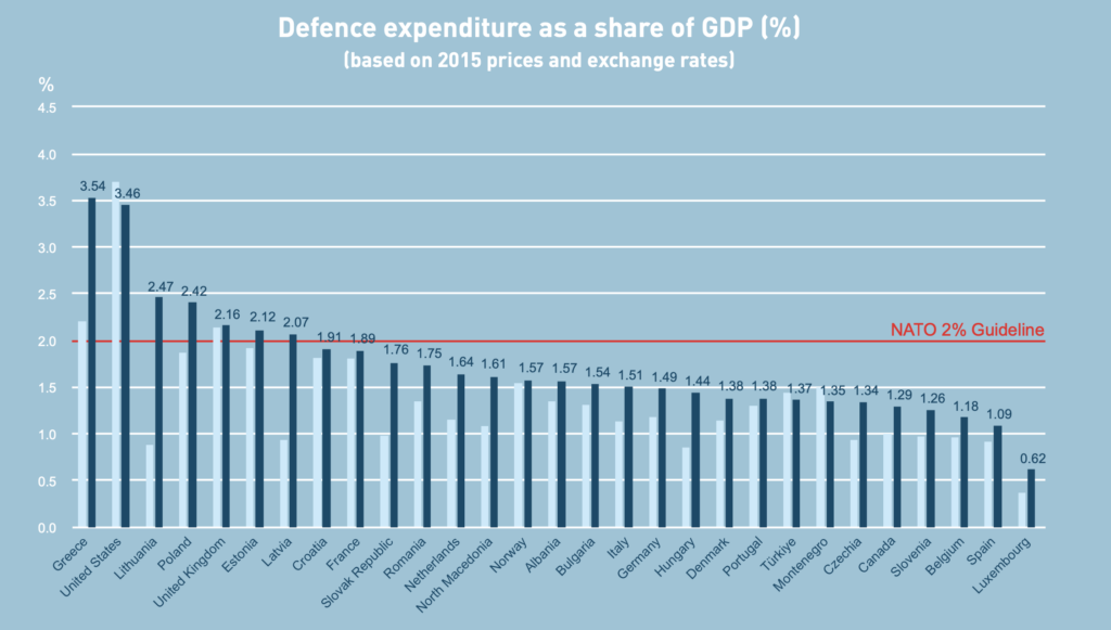 A total of five of the seven countries that reached the target are from the Eastern side of Europe: Lithuania, Poland, Estonia, Latvia and Greece. The latter country had the highest rate of expenditure, with 3.54% of Greece’s GDP now dedicated to military spending.