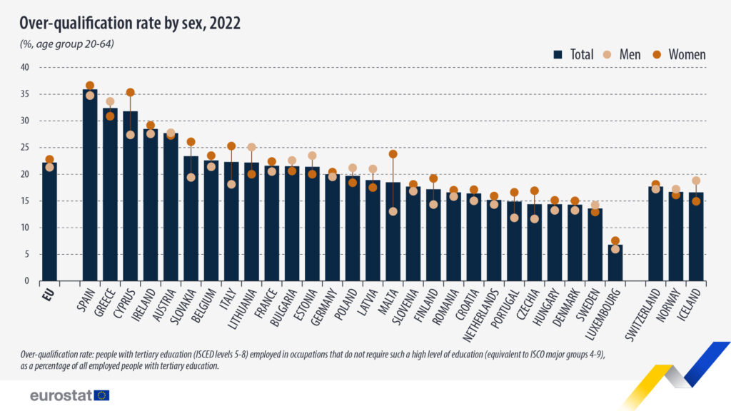 In 2022, the EU over-qualification rate was 22%, with 21% for men and 23% for women, according to Eurostat. Over-qualification is when people with tertiary education are employed in occupations that do not require such a high level of education, Eurostat wrote, adding that “since 2023 is the European Year of Skills, these statistics might help to inform policymakers how people in the EU fare in terms of application of their qualifications.”