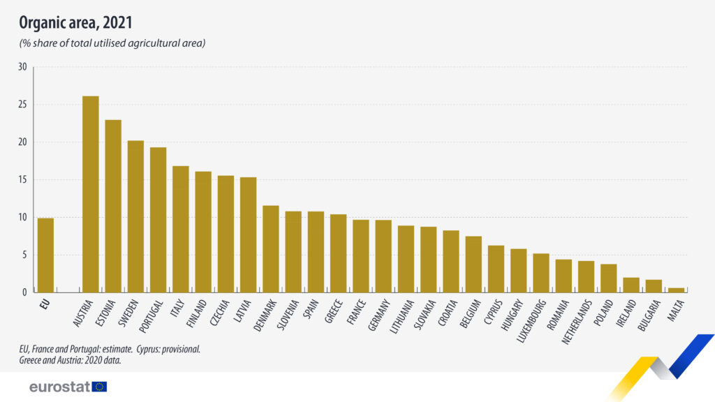 In 2021, the area used for organic farming expanded to 15.9mn hectares (ha) – or just under 10% of the total UUA in the EU – up from 14.7mn ha in 2020.