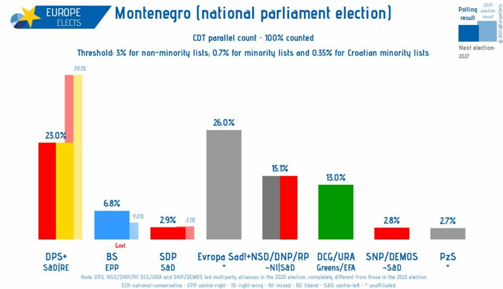 Europe Now, formed in June 20022 and led by former finance minister Milojko Spajic, obtained 26%. Spajic underlined the urgency of forming the new government to expedite reforms, stating that they would negotiate with “like-minded parties”, but not the Democratic Party of Socialists (DPS).