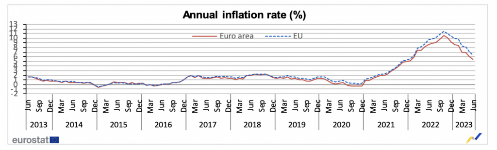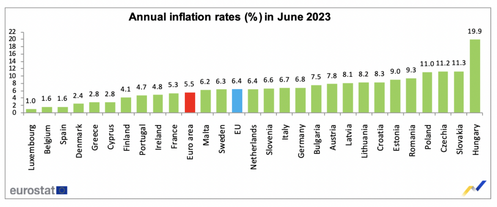 Overall in the EU, Eurostat announced, inflation fell to 6.4% in June 2023, down from 7.1% in May. A year earlier, the EU’s inflation rate was 9.6%.