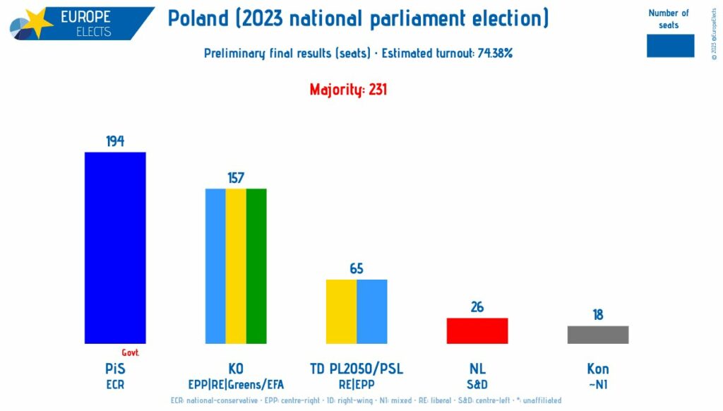 Youth voters were mobilised and turnout was an unprecedented 74.38%, as three opposition groups won mandates for a majority of 248 MPs in the 460-seat Sejm, Poland’s lower house.