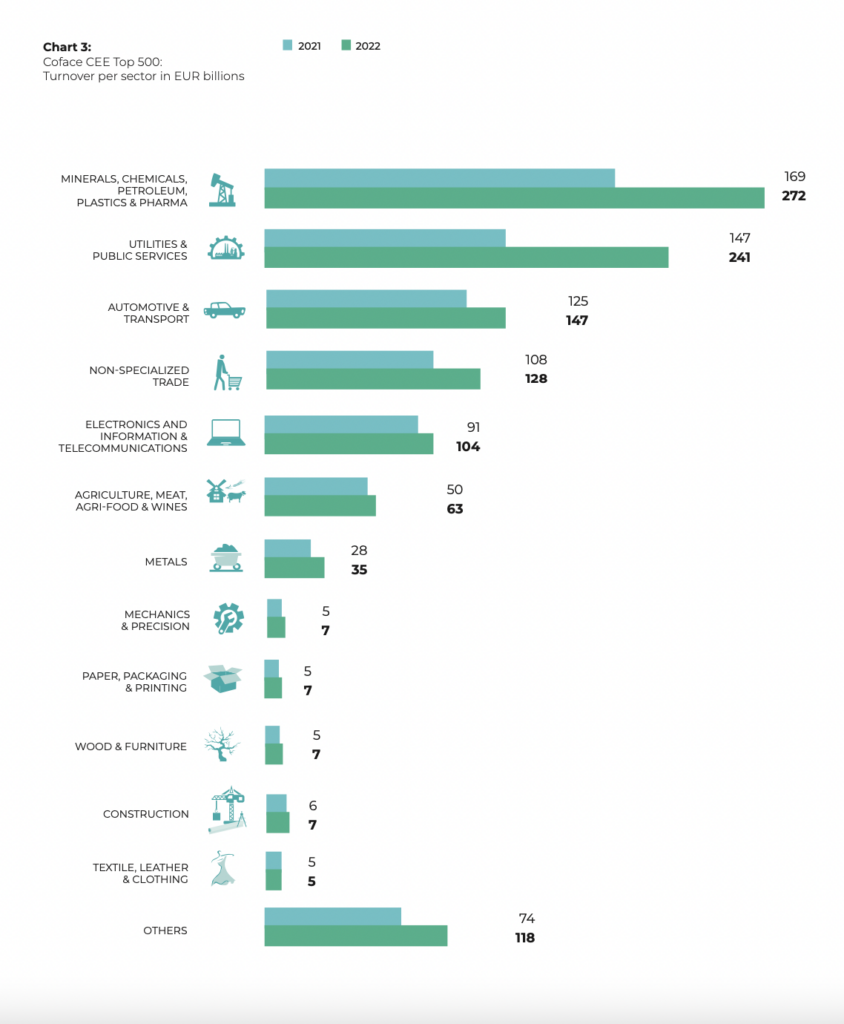 Hungary was pushed down to 4th place, with 54 companies on the list, down 10. Aggregated turnover amounted to EUR 142.4bn in 2022, while the Coface credit assessment for Hungary is 6.3, just below the CEE average. Minerals, Chemicals, Petroleum, Plastics and Pharma is the biggest sector for generated turnover, of 24.6%, among large Hungarian companies. In second place is Electronics and IT, and in third Automotive and Transport, with 18.8% and 14.5% respectively.