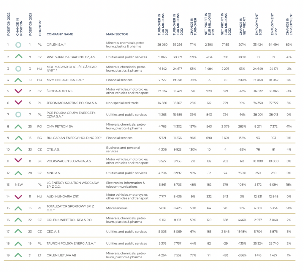 Czechia remains in second place. Despite shedding 15 companies last year, 77 firms generated an aggregated turnover of EUR 210bn, up 33%, as net profits soared by 103.7%.