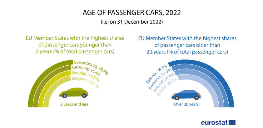 The highest share of cars aged 2 years or less in the EU member states was in Luxembourg (18%), followed by Germany and Sweden (15%), and Belgium, Ireland and Austria (13%).