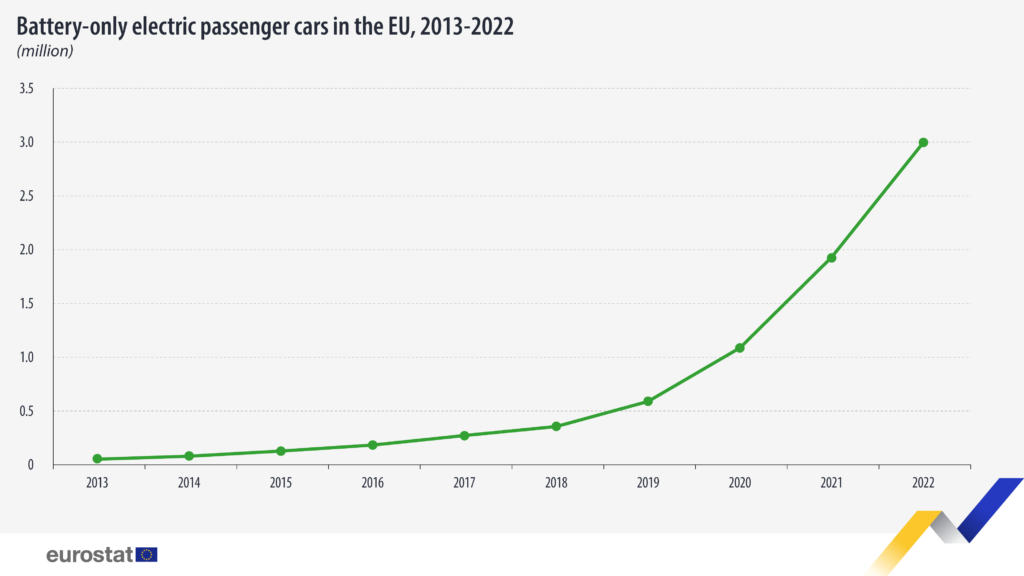 Reading Time: 2 minutesThe number of battery-only electric passenger cars in the EU neared 3mn in 2022, up 55% from 1.9mn in 2021, according to the EU’s official statistics office Eurostat.
