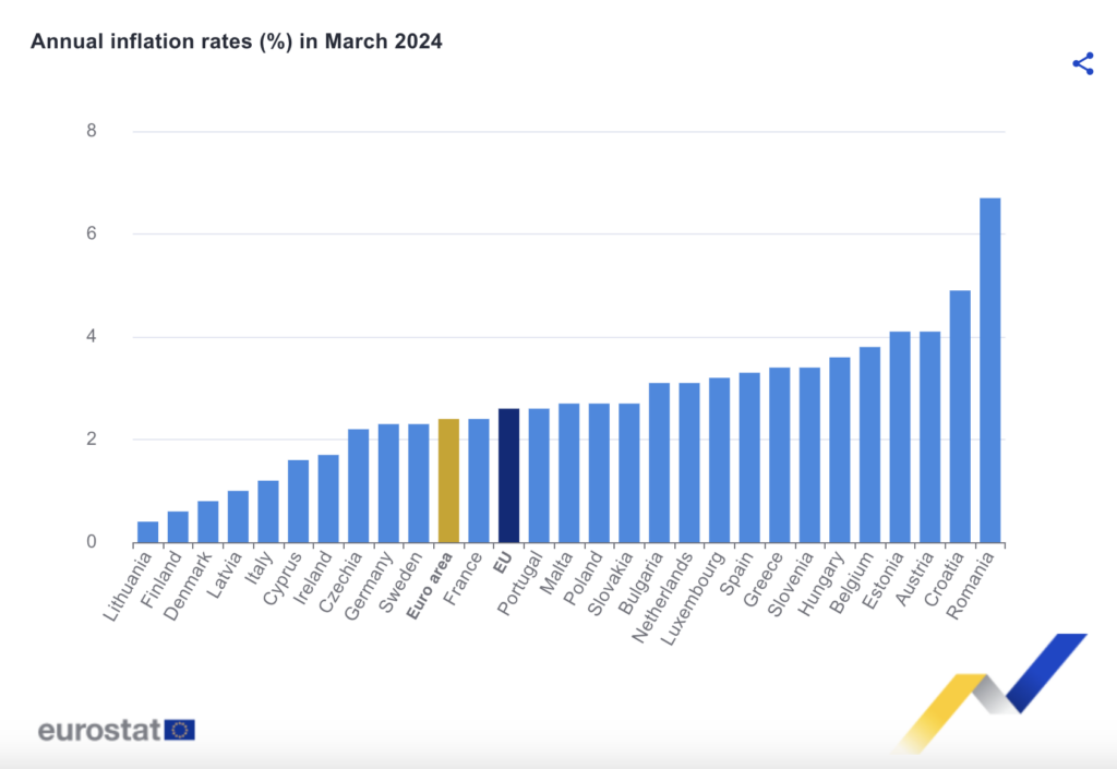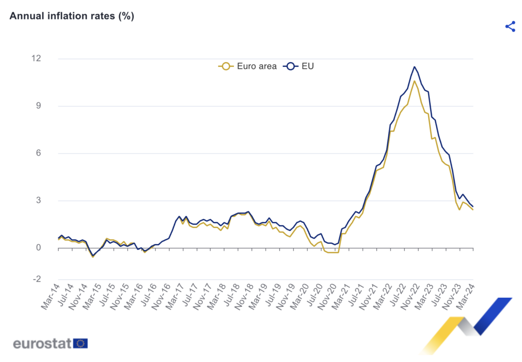 Inflation in the eurozone was 2.4% in March, down from 2.6% the previous month, significantly down from the 6.9% a year earlier.
