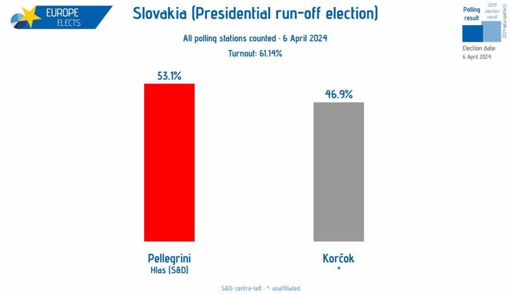 Reading Time: 3 minutesPeter Pellegrini of Slovakia’s nationalist-left ruling coalition beat pro-Western opposition candidate Ivan Korcok by 53.1% to 46.9% in the presidential election on Saturday, 6 April. Turnout was 61.14%, the highest for a presidential election in Slovakia since 1999.