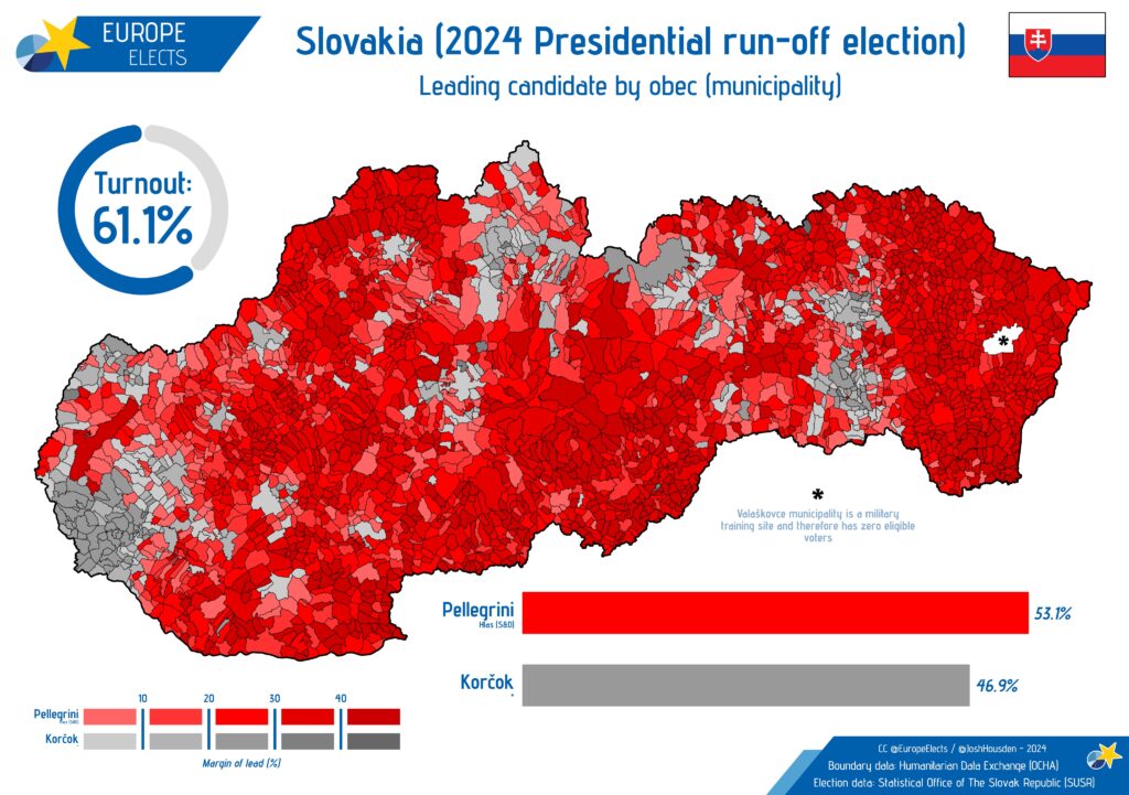 A geographical distribution of votes show Pellegrini dominating in the South and the rural areas while Korcok took the two largest cities of Bratislava and Kosice. Turnout was historically higher than average for the election of the Slovak head of state.