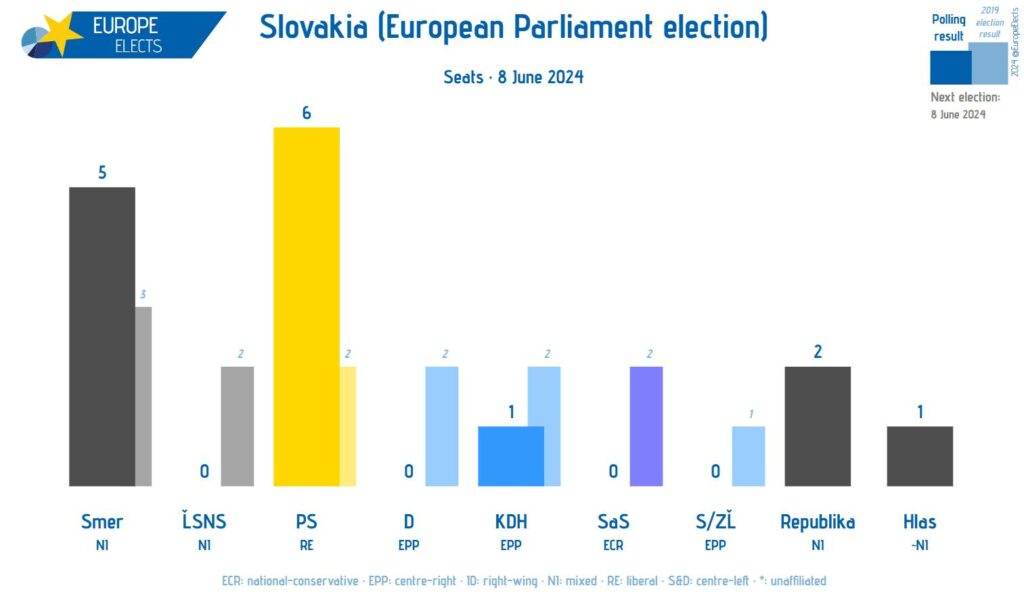 However, Progressive Slovakia (PS) over the weekend emerged victorious with 27.81% of the votes, securing 6 seats in the European Parliament (EP), local media reported. Smer-SD trailed closely behind with 24.76%, earning five seats in the 720-member EU assembly. Far-right Republika secured the third position with 12.535 of the votes and 2 MEPs, according to the results. Has and KDH each secured a single MEP. Turnout for the EP election, notoriously low in Slovakia, was higher than in previous years, nearing 35%.