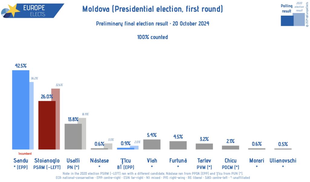 Although Stoianoglo garnered only 26% of a parallel presidential vote, trailing Sandu’s 42.5%, he significantly outperformed pre-election polls while the tight EU referendum result laid bare the duality of Moldovan society. Sandu’s failure to secure more than 50% of the vote means she will face Stoianoglo in a runoff election on 3 November. Populist former mayor Renato Usatii came in third with 13.8%.