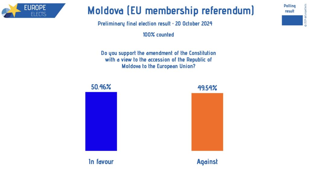 Reading Time: 3 minutesIn a knife-edge referendum that laid bare Moldova’s internal divisions and heightened geopolitical tensions, the country’s voters backed constitutional changes aimed at securing EU membership on Sunday, 20 October, with 50.46% voting in favour and 49.54% against.