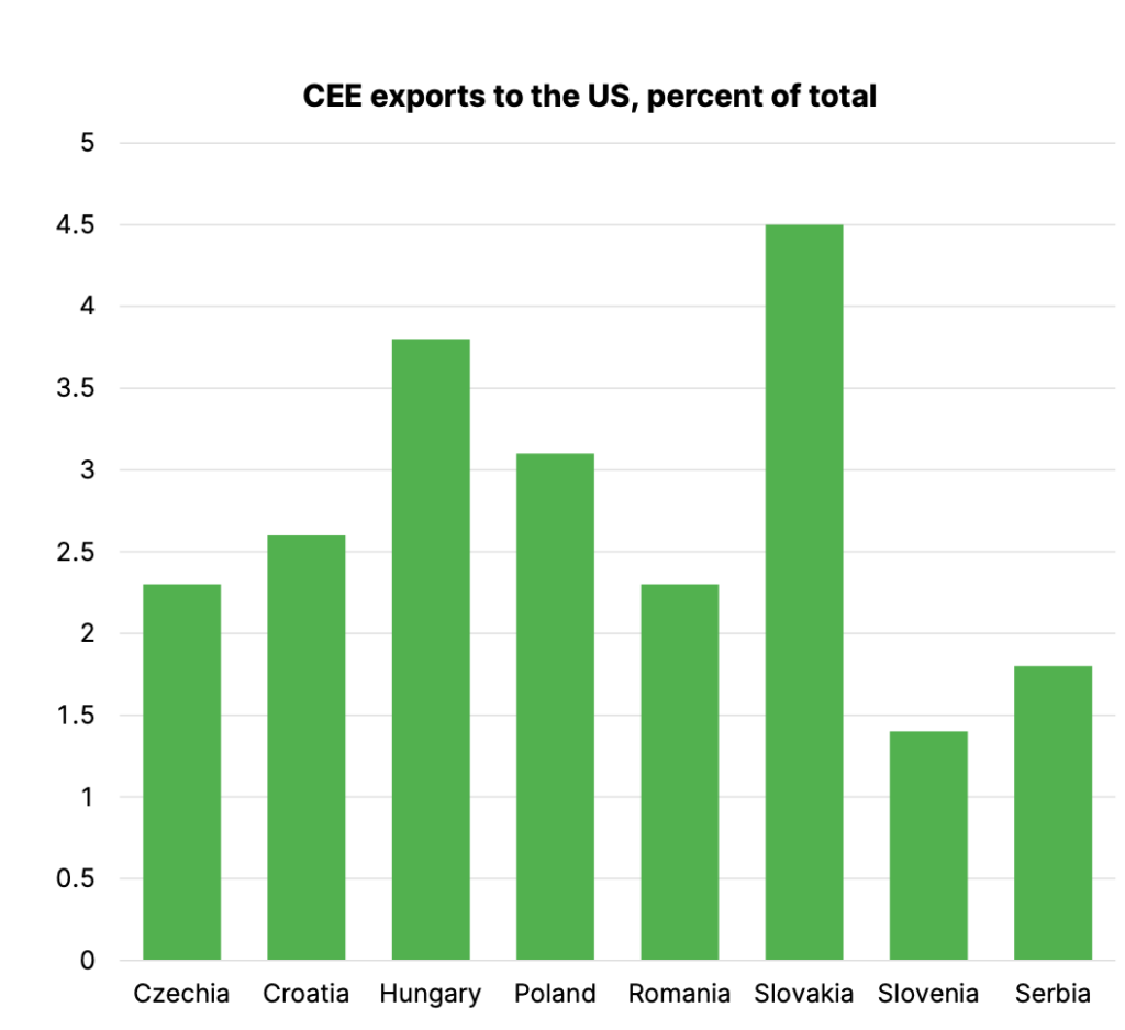 Erste Group noted that while exports to the US make up a small portion of total exports for most CEE countries, Slovakia and Hungary are most exposed. Slovakia exports 4.5% of its total goods to the US, and Hungary’s 3.8%. These exports are predominantly in the automotive sector, with vehicles and automotive parts being the top goods.