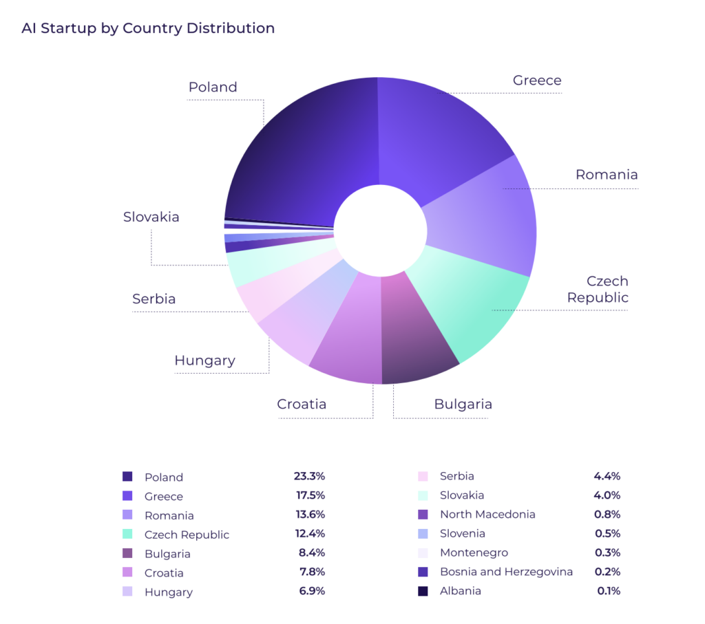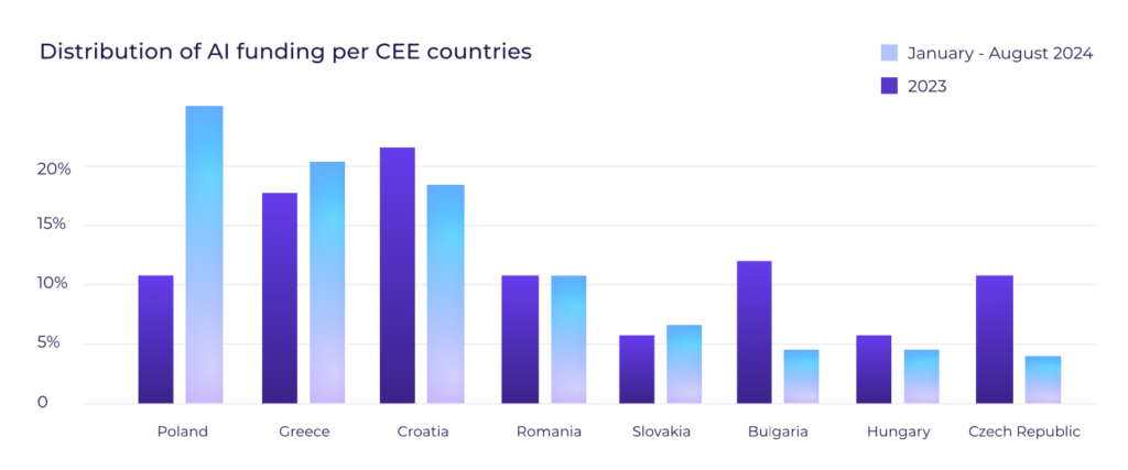 Poland and Croatia have emerged as standout players in the region’s AI ecosystem. Poland leads in funding, with startups raising EUR 171mn in 2024, buoyed by successful ventures such as ElevenLabs, which has attracted global attention. Croatia also recorded significant investment, particularly the EUR 100mn raised by AI unicorn Verne, which specialises in logistics optimisation.