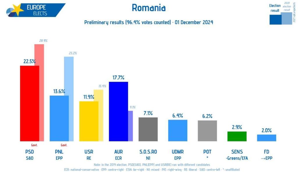 With 96.4% of votes counted, the ruling Social Democratic party (PSD) had 22.5% of the votes to the far-right nationalist Alliance for the Union of Romanians (AUR) on 17.7%. The National Liberal Party (PNL) garnered 13.6% and the conservative Save Romania Union (USR) 11.9%.
