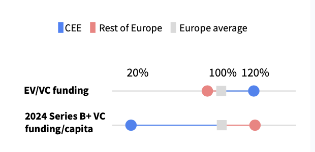 Total VC investment in CEE was EUR 2.3bn in 2024, a fraction of Western European volumes, with EUR 505mn going to late-stage startups. The CEE average for Series C+ rounds was EUR 36.4mn, well below the European average.
