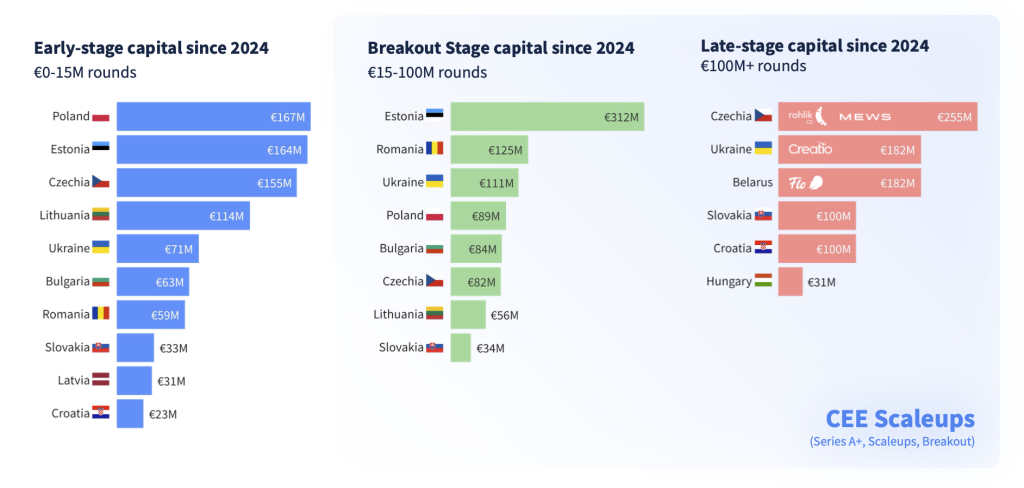 Estonia punches well above its weight, accounting for 18% of all scaleups in CEE, with just 0.8% of its population. The country leads in breakout-stage (EUR 15mn-100mn) funding, underscoring the strength of its startup support infrastructure and access to early growth capital.
