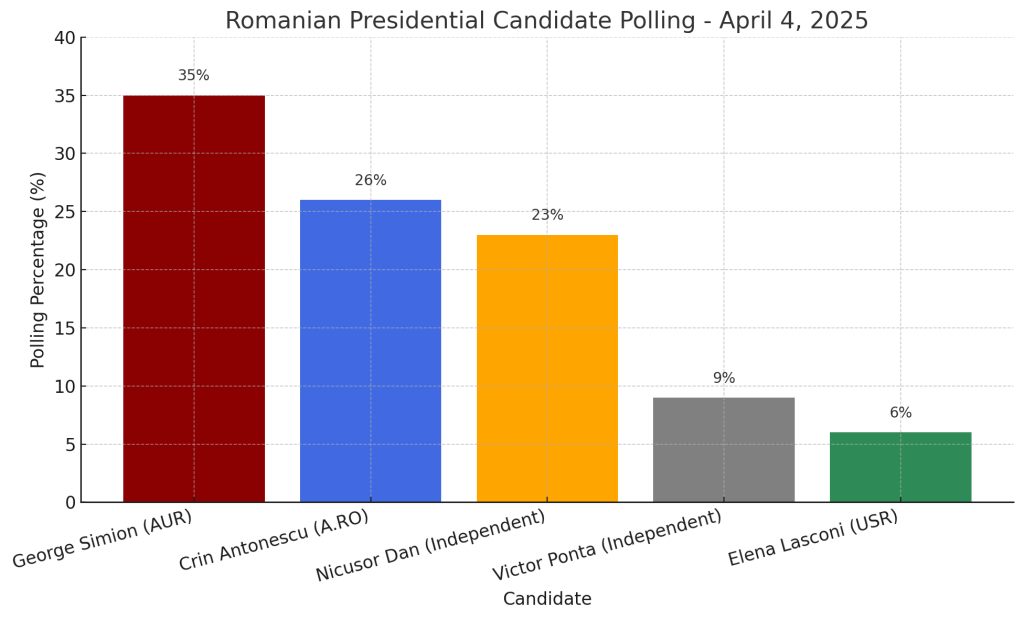Crin Antonescu, candidate of the ruling coalition, most recently polled at 26%, campaigning for stability and EU integration. Independent Bucharest Mayor Nicusor Dan, with a platform focused on anti-corruption, urban development, and EU commitments, currently has 23% support.