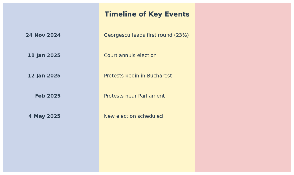 Georgescu, previously a minor political figure, unexpectedly led the first round on 24 November with nearly 23% of the vote. The Romanian Constitutional Court then annulled the election results on 11 January, citing evidence of a coordinated Russian disinformation campaign.